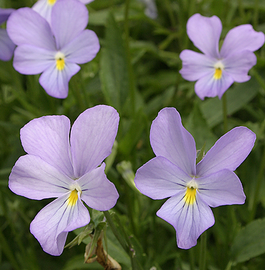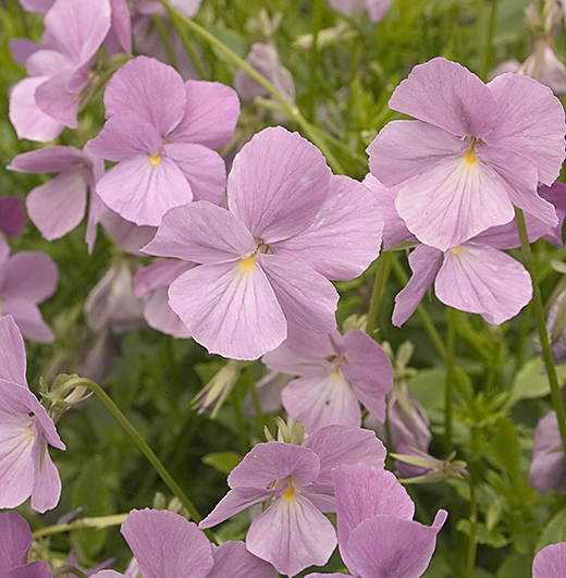 Viola cornuta 'Belmont Blue' Lovely very pale sky-blue flowers, 2.5cm. across, all summer. Very vigorous & makes good ground cover.