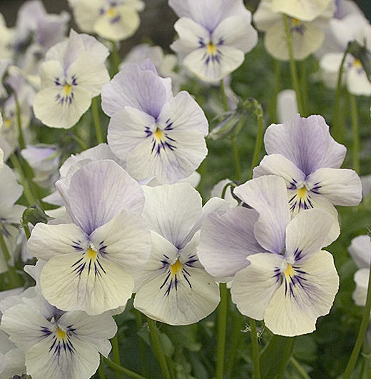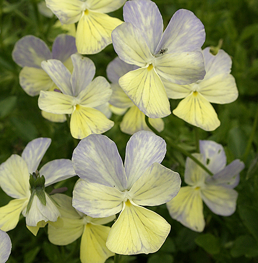 Viola cornuta 'Clouded Yellow' (EM) Beautiful combination of pale creamy yellow overlaid with pale slatey-blue streaks and veins. A lovely and most unusual cultivar.