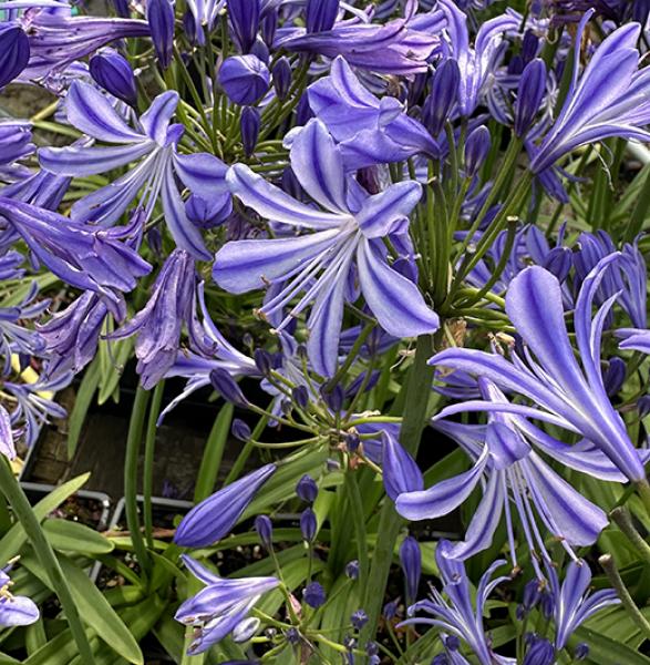 Agapanthus 'Charlotte' Evergreen, making neat clumps. Sturdy stems produce beautiful pale blue flowers with a dark central stripe on each petal. July to August flowering, for full sun in a sheltered site. 70cm. high. Price: £8.50 Notes: Harmful if eaten