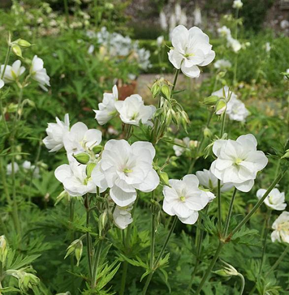 Geranium pratense 'Laura' Vigorous variety with pure white double flowers in July and August. 60cm. high.