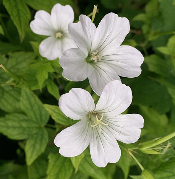 Geranium nodosum 'Silverwood' Clumps of glossy green foliage topped by pure white flowers for an exceptionally long season, May to September. Good in shade, even dry shade. 40cm. high.