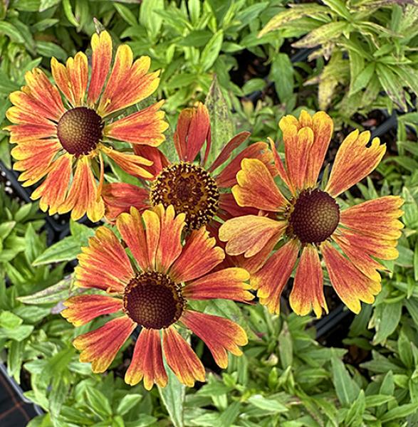 Helenium 'Strawberry Sundae' Compact habit and sturdy upright stems carry numerous coppery- crimson flowers often tipped yellow at petal edges. Long flowering, summer and autumn, for sun or part shade. 60cm. high. Price: £7.50