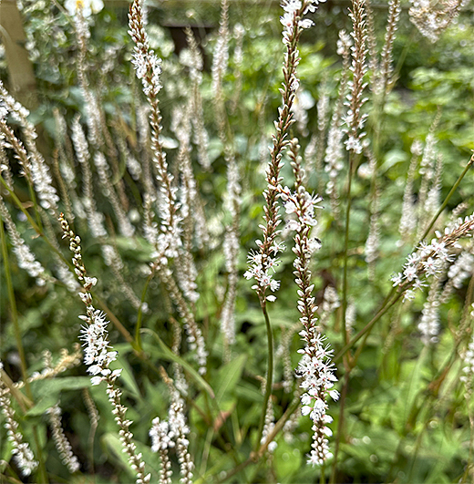 Persicaria amplexicaulis 'Alba' Lovely more delicate form. Tall spikes covered with tiny white flowers for an exceptionally long season, early July to October. Likes a retentive soil in sun or part shade. To 1.5m. high. Beautiful in combination with Anemone 'Honorine Jobert' Price: £7.50