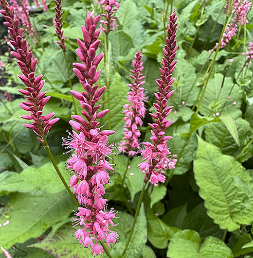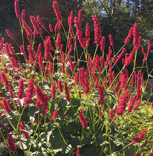 Persicaria amplexicaulis 'Flamingo Feathers' Graceful slender spikes of vivid-pink flowers in profusion from early summer till autumn. makes a perfect foil for larger flowers like Anemones. Sun or part shade 120cm. high. Price: £7.50