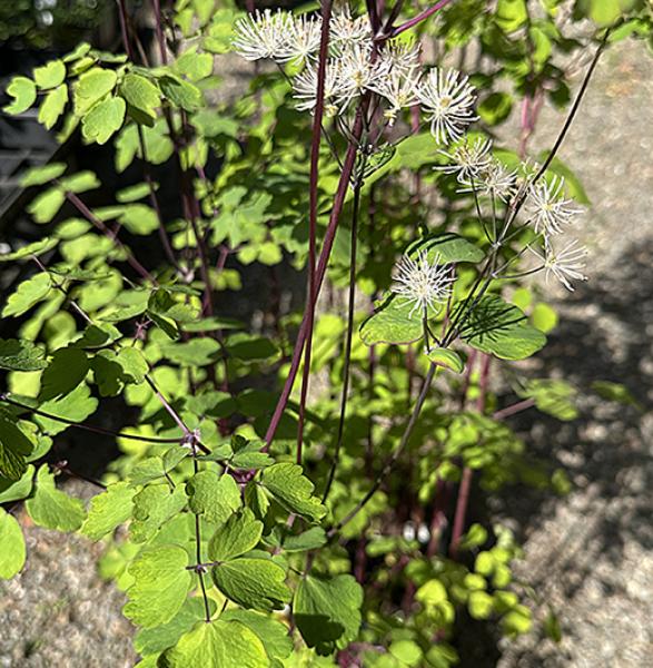 Thalictrum rochebruneanum One of the strongest growing Thalictrum species making large clumps of glaucous, purple-tinted foliage. Very tall stout upright stems carry a mass of soft-purple flowers filled with yellow stamens. 140cm. high. Price: £7.50