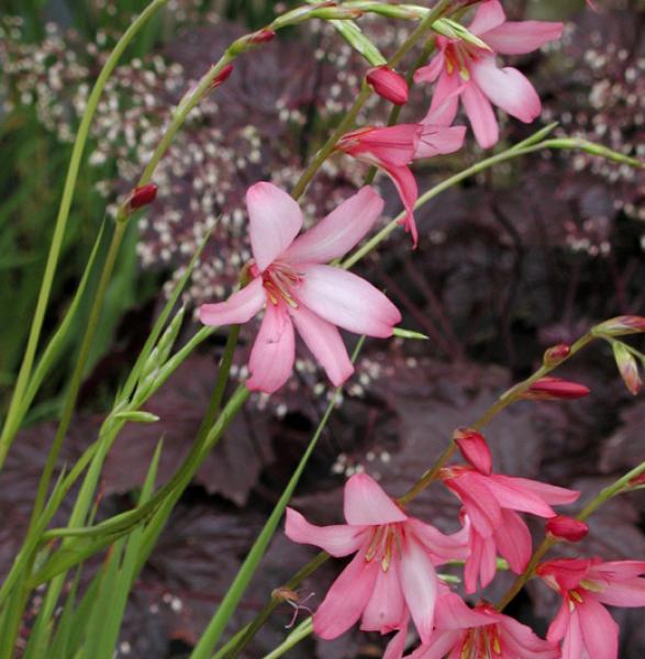 Tritonia disticha subs. rubrolucens A very graceful addition to the late summer garden. Grassy clumps produce wiry stems of delicate warm-pink tubular lily-like flowers. Tough easy habit belied by its delicate appearance. Prefers sun. 60cm. high. Price: £7.50
