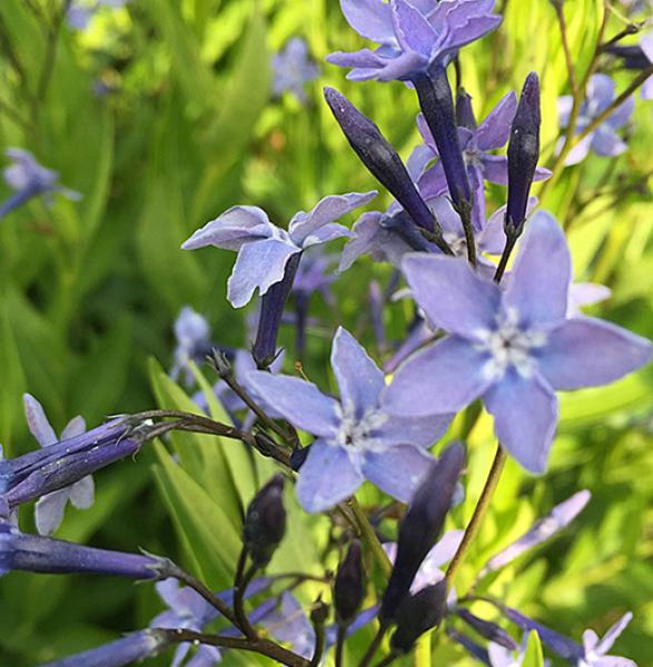 Amsonia 'Blue Ice' Long blooming compact form. Navy buds open to sky-blue star-shaped flowers, late spring to late summer. Makes nice willowy clumps in sunny site. 45cm. high.