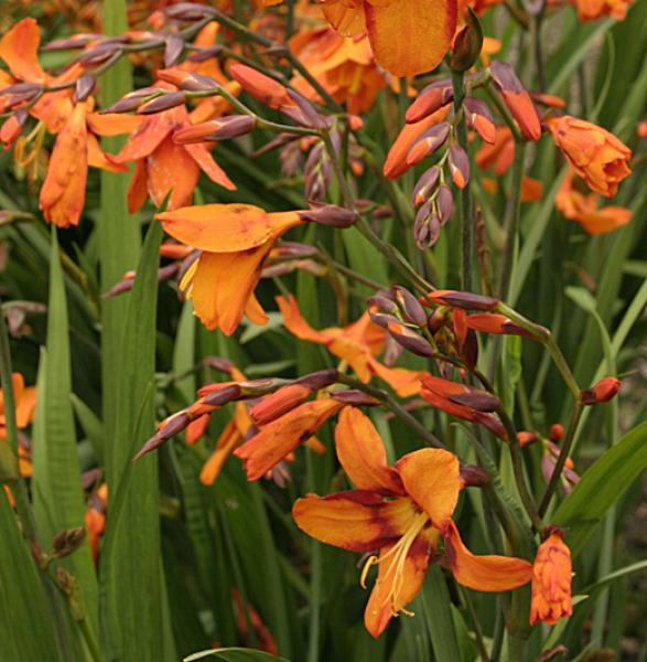 Crocosmia x crocosmiiflora 'Emily McKenzie' Unusual cultivar, one of the last to flower, terracotta-orange with a very distinct maroon central zone. Lovely. 50cm high. In flower September to October.