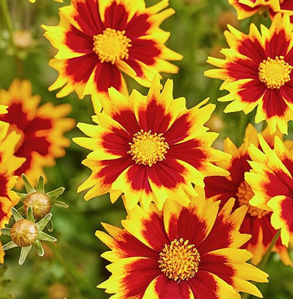 Coreopsis 'Daybreak' Compact perennial producing mounds of foliage topped by an abundance of bi-coloured flowers, fiery red edged yellow. In flower all summer. Likes sun, 30-40cm. high. Price: £7.50