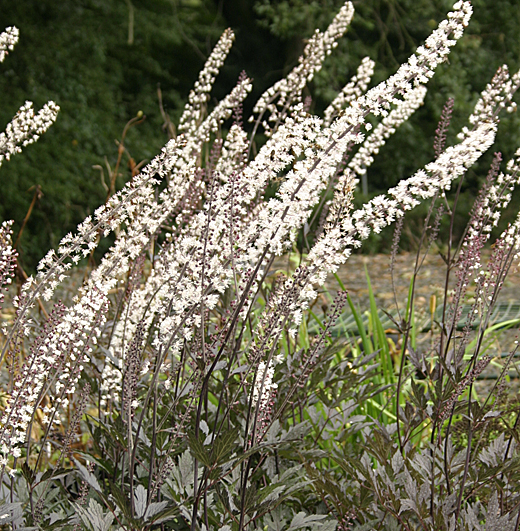 Actaea simplex 'Pink Spike' Large clumps of deeply divided mahogany leaves, tall dark stems above, studded with scented flowers, opening white and fading to pink. Very attractive to bees and butterflies in late summer. August to October. 130cm. high.
