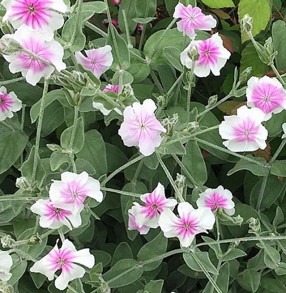 Lychnis coronaria 'Oculata' A pretty cottage-garden plant, making clumps of silvery, woolly leavesand white flowers, rose-pink in the centre, on arching stems in mid to late summer. 60-60ce. high. For sun and good drainage. Price: £7.50