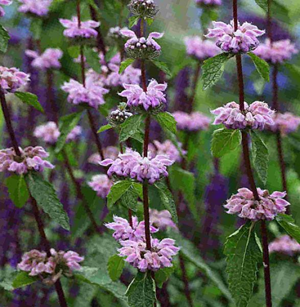 Phlomis tuberosa 'Prima Donna' Phlomis are known for their architectural presence. Clumps of silvery foliage with upright dark stems producing whorles of lilac-pink flowers in July and August. Likes a sunny site. 100cm. high. Price: £8.00