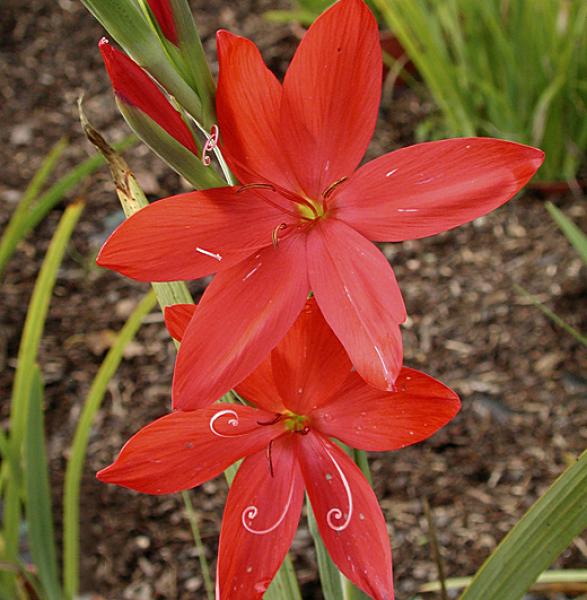 Schizostylis coccinea 'Red Dragon' Spectacularly good form with very large flowers, 8cm. across, in a deep luminous red. The best red form I have seen. 60cm. high. Price: £7.50