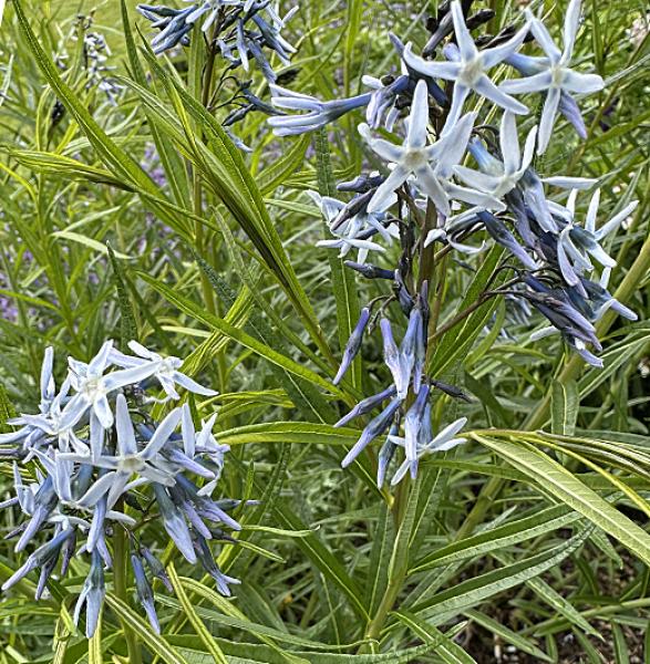 Amsonia 'Blue Ice' Long blooming compact form. Navy buds open to sky-blue star-shaped flowers, late spring to late summer. Makes nice willowy clumps in sunny site. 45cm. high.