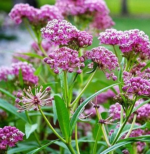 Asclepias incarnata Perennial with strong upright stems of purplish-pink flowers from mid summer into autumn. Very attractive to pollinators. Likes damp soils but is very tolerant of most normal soils. 120cm. high. Price: £7.50