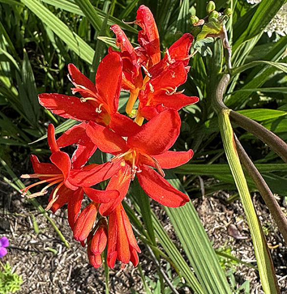 Crocosmia x crocosmiiflora 'Babylon' Very large open bright-red flowers, later than other Crocosmias, from end August onwards. 75cm. high.