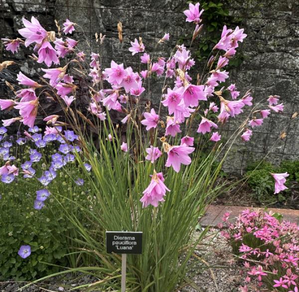 Dierama pauciflora 'Luana' A compact form of 'Angel's Fishing Rod', grassy clumps of foliage with arching stems of clear-pink bell shaped flowers in summer. 40cm. high.