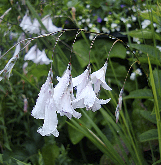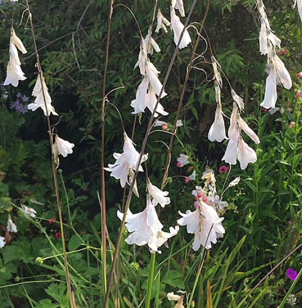 Dierama 'Guinevere' Tufts of grassy foliage produce strong arching stems holding pure-white dangling bell flowers, June to August. 90-100cm. high, for sun and good composty soils. Divisions from the true form Price: £7.50